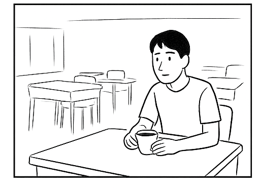 Lopulta A löytyy ruokalasta kahvikupin äärestä